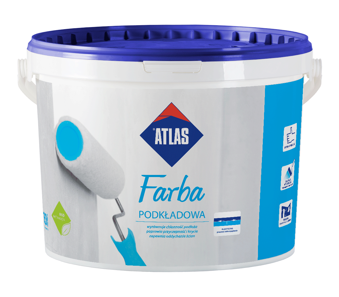 Atlas Farba, white acrylic interior paint. Base coat painting walls and ceilings indoors prior to application of top coat acrylic or latex paints. Particularly recommended for painting plasterboard substrates or those of heterogeneous texture.