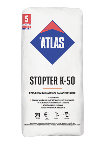 Atlas Stopter K-50 - VIP adhesive: White adhesive for external wall in thermal insulation. Proper for mineral wool and expanded polystyrene (white, graphite-enhanced and with addition of graphite). No priming masses under renders required - the unique structure of hardened adhesive creates a layer that provides a strong bond to thin-coat render, and white cement minimizes the risk of discolouration on the render surface.