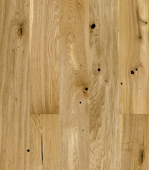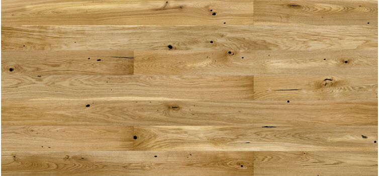 Holzdielen, die mit mattem Öl behandelt wurden, mit reicher Maserung und durch Bürsten hervorgehobenen Ästen. Durch vierseitiges Fasen wirken die Holzdielen zusätzlich länger.