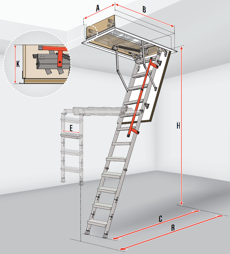 | Platzbedarf der ausgeklappten Bodentreppe | C [cm] | 123 | 132 | |||||||||