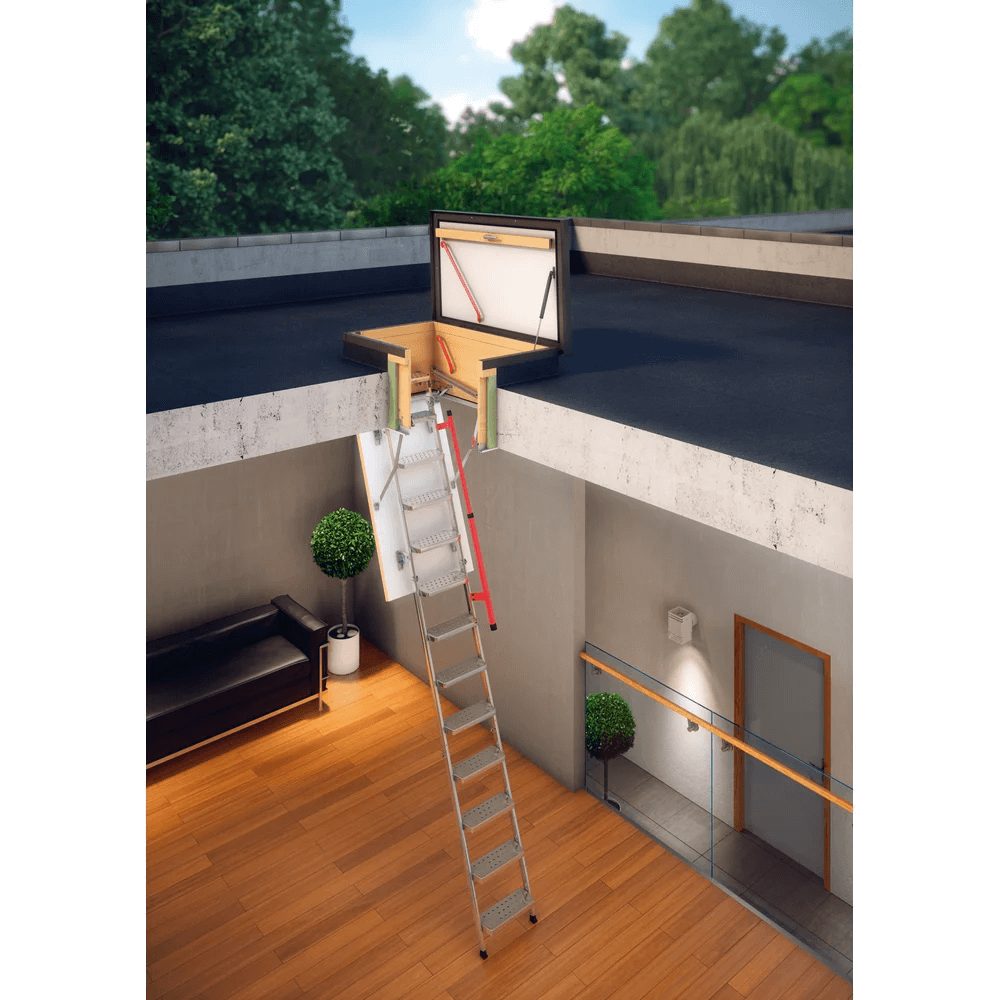 Die 3-teilige FAKRO Bodentreppe LML Lux mit Metallleiter steht für höchst komfortable Bedienung und Benutzung. Ausziehbare Leiterfüße ermöglichen eine Anpassung an die jeweilige Raumhöhe. Mit dem Schnell-Montage-System verlieren Sie beim Einbau keine Zeit.