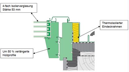 - Tripple-chamber passive glazing unit; consists of four panes of glass. The whole unit incorporates three layers of low-emission coating and warm TGI spacers. Three inter-pane voids are filled with inert gas – krypton. Such structured glazing units provide superb thermal performance Ug=0.3 W/m²K.