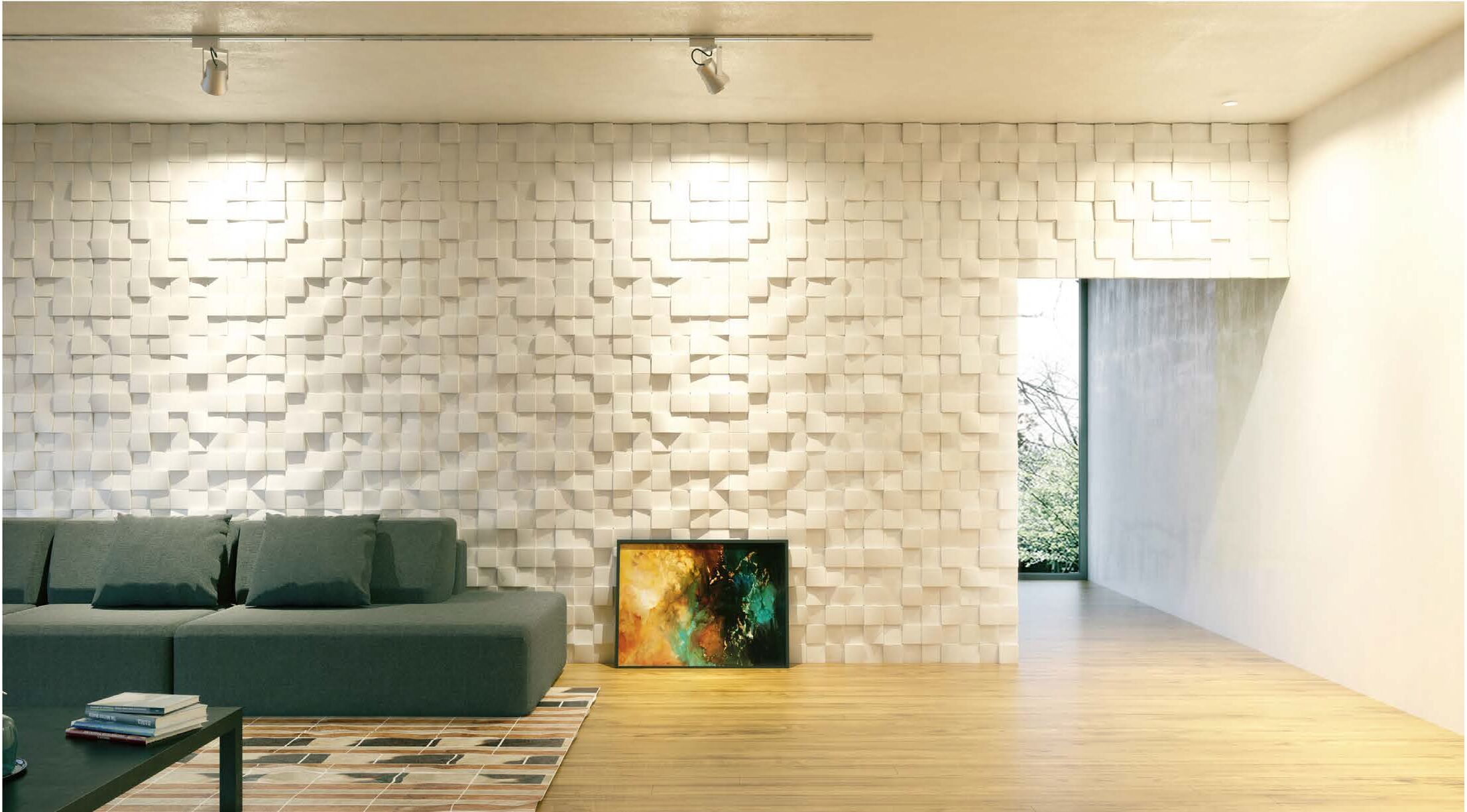 Die Paneele bestehen ausschließlich aus natürlichen Komponenten - einer sorgfältig ausgewählten Mischung von Gipsen und Mineralien. Die Wandpaneele sind umweltfreundlich und gleichzeitig sehr beständig. Die Paneele ziehen keinen Staub an, weisen einen neutralen PH-Wert auf, sind feuerbeständig sowie widerstandsfähig gegen biologische Korrosion. Aufgrund dieser besonderen Fähigkeiten helfen unsere Wandpaneele bei der Regulation des Mikroklimas der Räume. Durch die Konstruktion und Konzeption der Wandpaneele lässt sich jede Wunschgröße realisieren, von einem kleinen optischen Hingucker bis hin zu flächendeckender Anbringung, und ebenso eine Vielzahl erstaunlicher visueller Effekte bei entsprechendem Arrangement. Die Paneele können endlos verlegt werden und passen dennoch immer zueinander. Die gewölbte (3D-)Struktur sorgt für einen unnachahmlichen und einzigartigen Stil, der auch ein sehr interessantes Spiel mit Licht und Schatten bietet. Zusätzliche ansprechende Effekte lassen sich durch individuelle Gestaltung erreichen, sei es ein Farbanstrich oder auch passende farbige Beleuchtung.