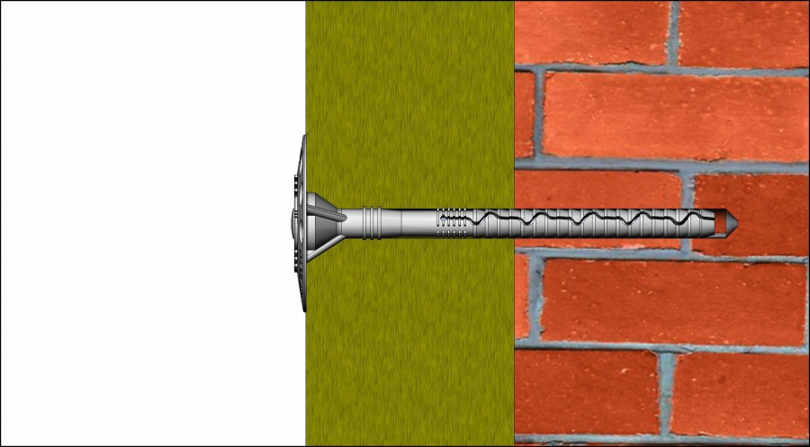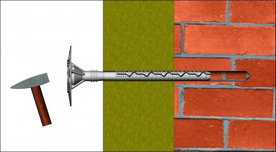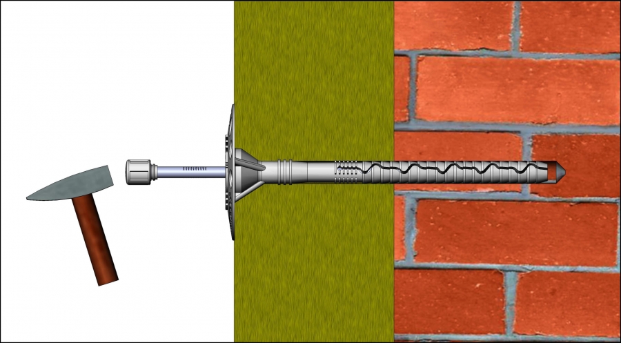 Hammer insulation fixing with an insulated metal pin designed for embedding of Jointless Facade Thermal Insulation Systems.