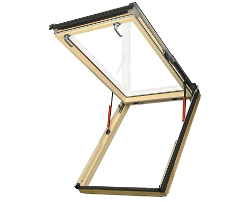 Das Notausstiegsfenster FAKRO FEP P2 gehört zu den fenster mit Klapp-Schwing-Konstruktion. Mit Hilfe der oberen Griffe kann man auch hier den Fensterflügel um 180 Grad in die Putzstellung schwenken. Zudem ermöglichen die unteren Griffe einen Öffnungswinkel von 40 Grad. Das Notausstiegsfenster besitzt zwei Arretierungshalter. Nach dem Entsperren der Arretierungshalter lässt sich der Öffnungswinkel im Notfall von 40 auf 68 Grad vergrößern. Dies sichert bei Bedarf einen schnellen Ausstieg aus dem Raum.