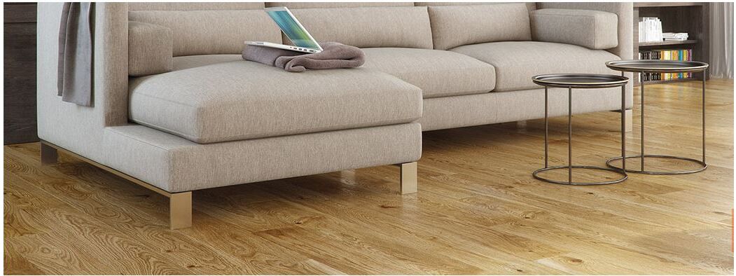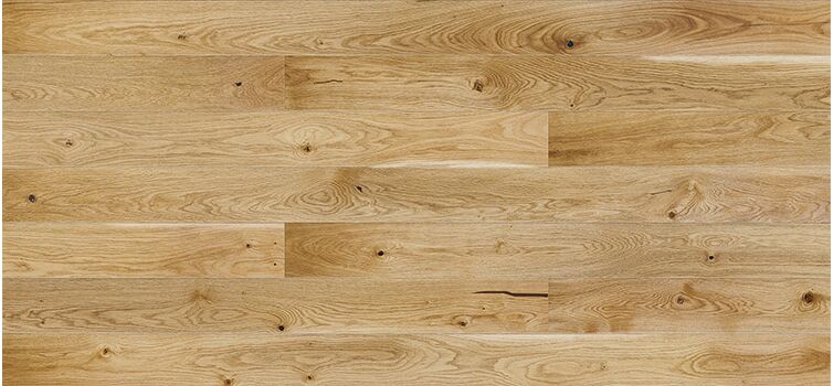 Ein ruhiger Eichenfußboden mit einer schönen Farbe und gleichmäßiger Holzstruktur. Der natürliche Charakter wurde durch das Bürsten betont, die vierseitige Microfase lässt den Boden schmaler erscheinen. Das Naturöl verleiht der Oberfläche eine angenehme Haptik.