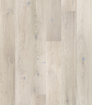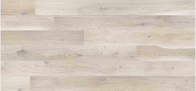 Eiche Tender ist breites 1-Stab-Parkett mit Weißtönen, die mit Naturöl behandelt wurden. Die Holzstruktur wurde durch das Bürsten hervorgehoben.