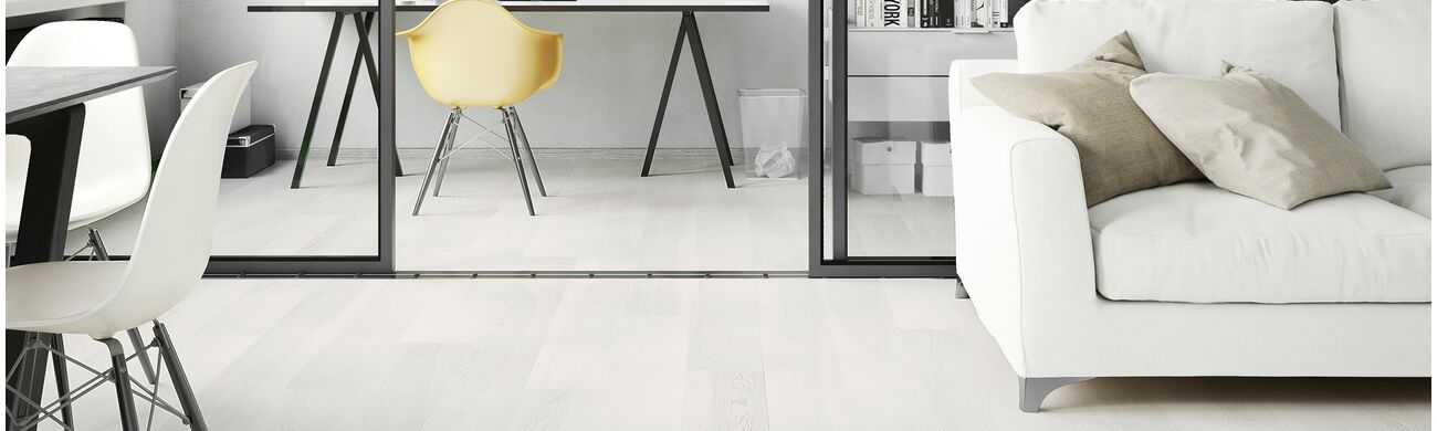 Parquet Ash Lemon Sorbet Grande is a single-strip floor, with a frosty lemon shade of sorbet. Modern, bold form, covered with white, matte lacquer. The edges are marked with a subtle microphase, which optically extends the shape of the boards. The structure of wood is highlighted by brushing and the whole is adorned with a moderate range of natural wood characteristics.