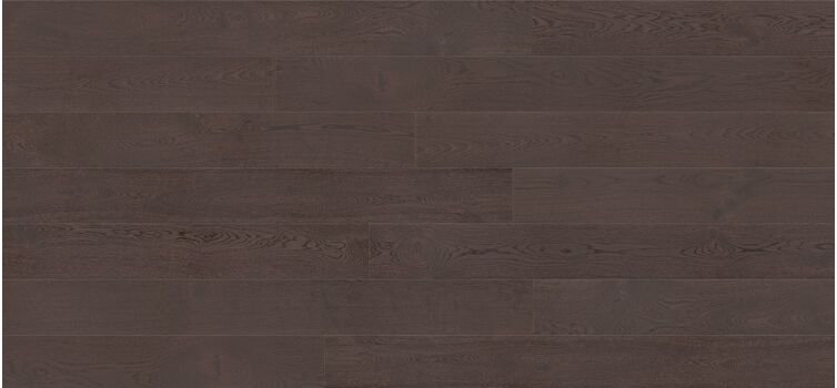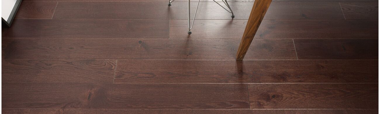 A dyed floor in an intense chocolate hue. Brushing brings out the structure of the wood. Boards with clearly trimmed edges (bevelling).