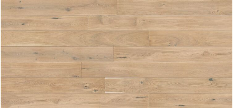 An oak board with a creamy colour. Brushing has enhanced the grain pattern and four sided bevelling has given the boards lightness.