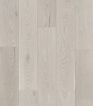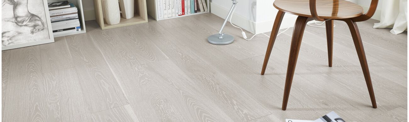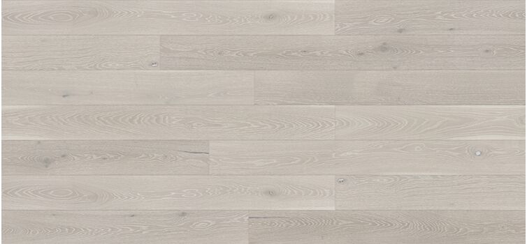 A double-dyed oak floor. The floorboard is further refined by white brushing and 4-sided micro bevelling. Coated with matte lacquer. Available in plain and 3-strip versions