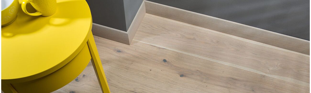 Oak touch is a elegant, wide, one strip, plain board coloured a shade of ash and coated with matte lacquer. It looks like real solid wood board.