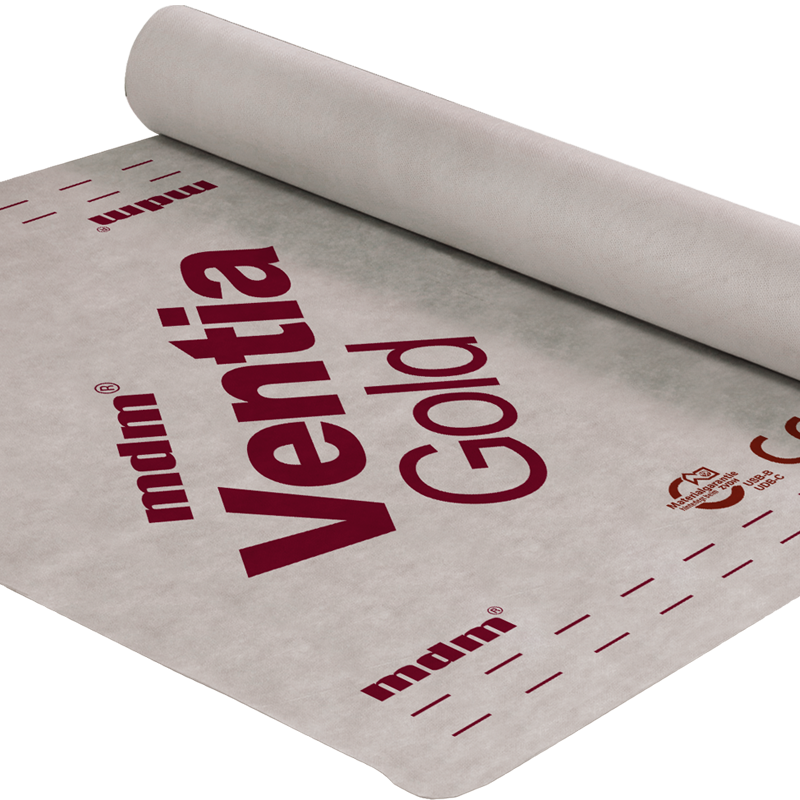 Die Unterspannbahn Ventia Gold ist dreilagig, bei einem Flächengewicht von 150 g/m2. Es handelt sich um eine robuste, alterungsbeständige und diffusionsoffene Folie, mit ausgezeichneter Wasserdampfdurchlässigkeit (Sd = 0,02m), welche für geschalte Dächer mit Hartschalung.